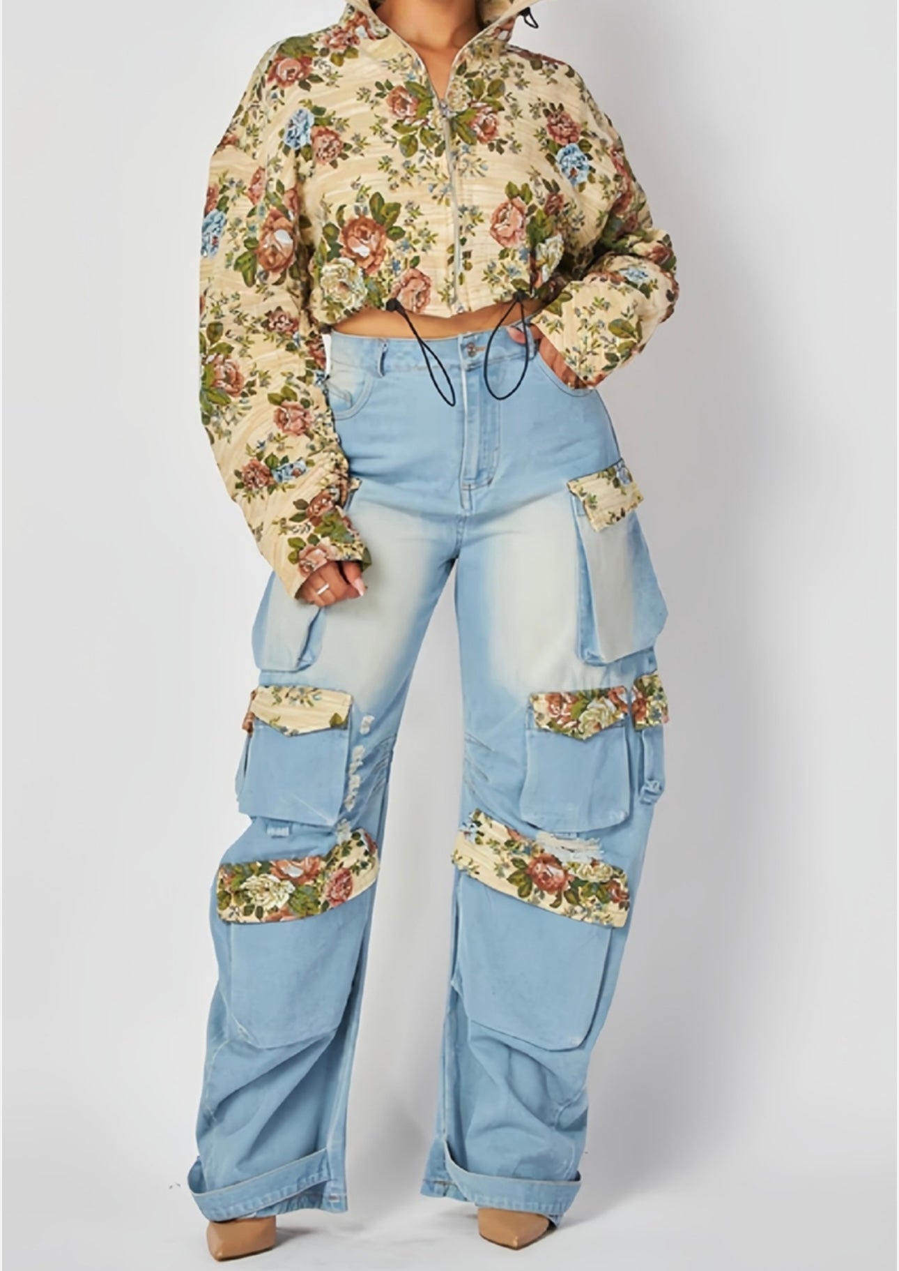Stylish Barrel Jeans Featuring Unique Floral Patchwork. Combines A Classic Look With Contemporary Flair. Perfect For Casual And Creative Ensembles.