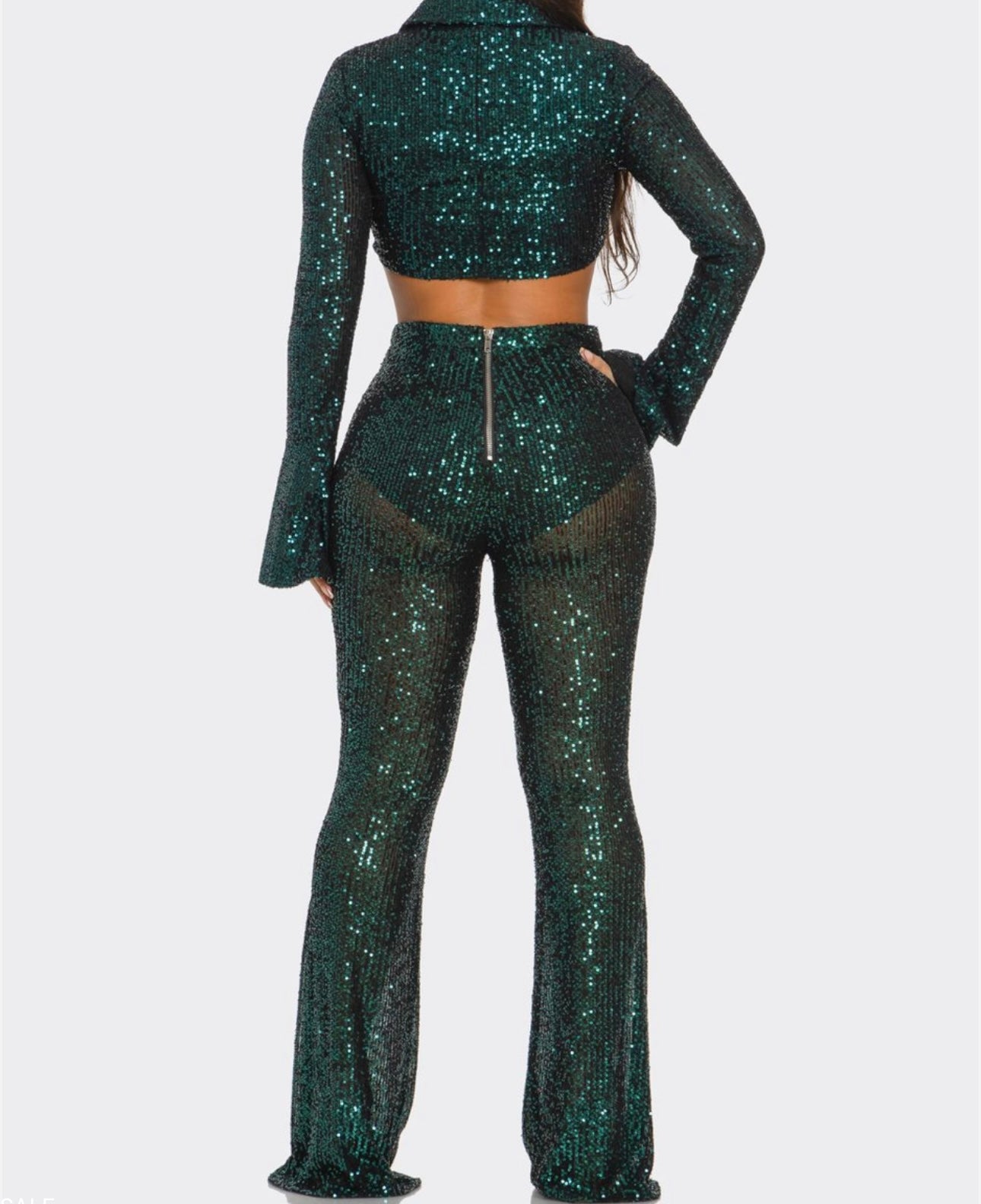 Featuring a flared long sleeve cropped blouse with a collar and silver rhinestone buttons. A high waisted sequined mesh flared bottoms and gold zipper to the back